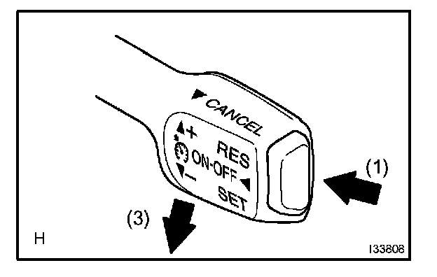 4. Momentarily push the control switch downward to -/SET, and then immediately release it. Check that the vehicle speed decreases by about 1.5 km/h (Tap-down function).