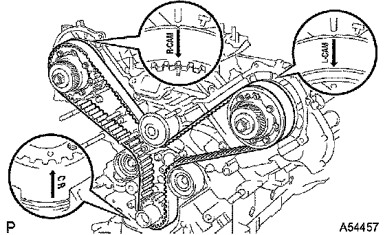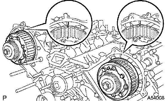c. Check that the timing marks of the camshaft timing pulleys and timing belt plates are aligned.