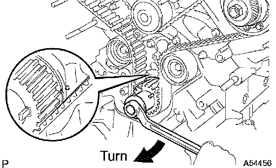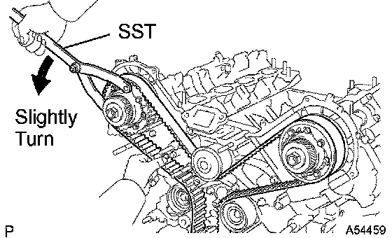 c. Using SST, loosen the tension between the camshaft timing pulley (RH bank) and crankshaft timing pulley by slightly turning the camshaft timing pulley (RH bank) counterclockwise.