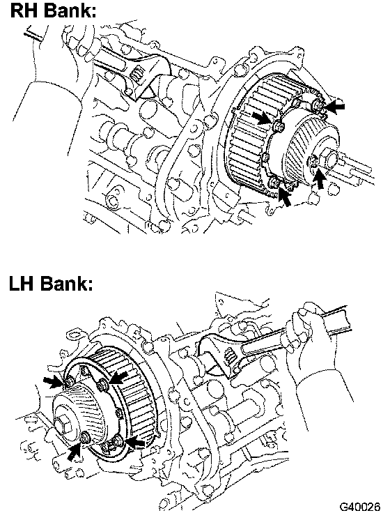 a. Hold the crankshaft with a wrench, and remove the 8 bolts and 2 timing pulleys.