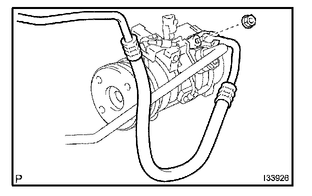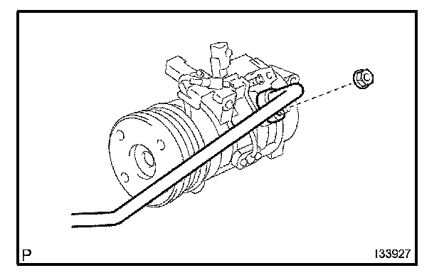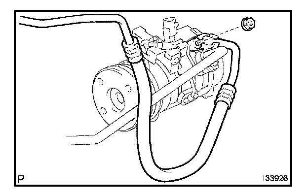d. Install the discharge hose sub-assembly on the compressor and magnetic clutch with the nut.