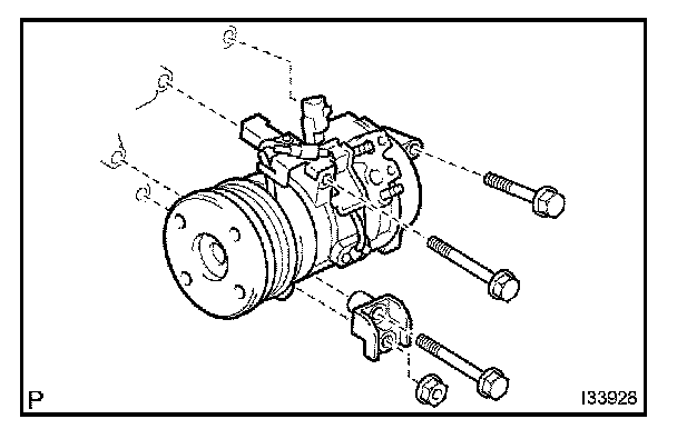 c. Remove the 3 bolts, stay, compressor and compressor and magnetic clutch.