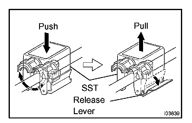 c. Pull SST slightly and push the release lever, and then remove the piping clamp with SST.