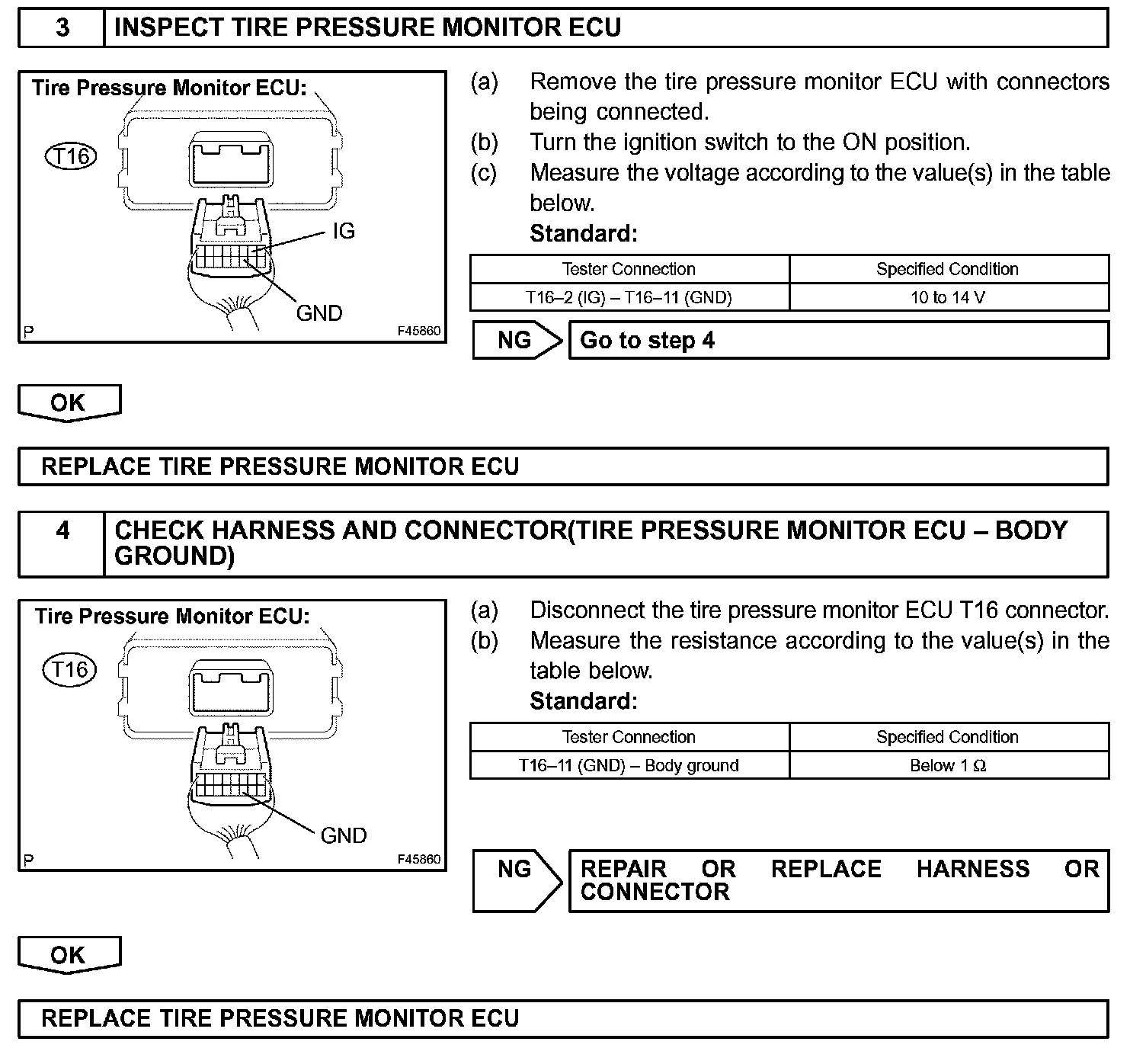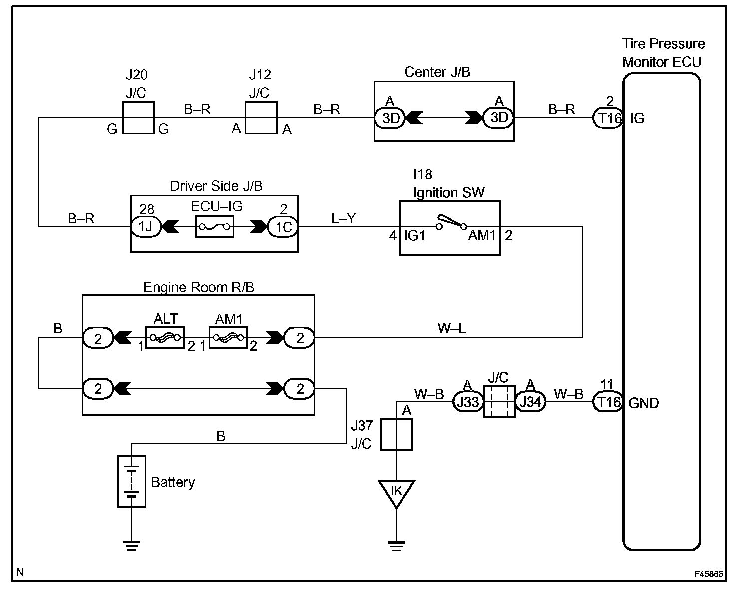 This is the power source for the tire pressure monitor ECU. It also supplies the power to the tire pressure monitor receiver via the ECU.