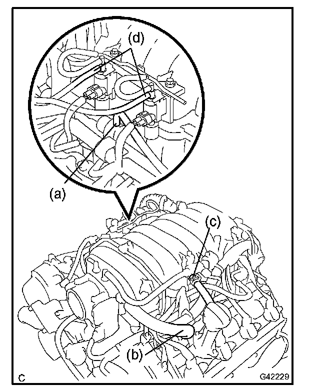 a. Disconnect the vacuum hoses (for the power steering idle-up and fuel pressure regulator) and ventilation hose.