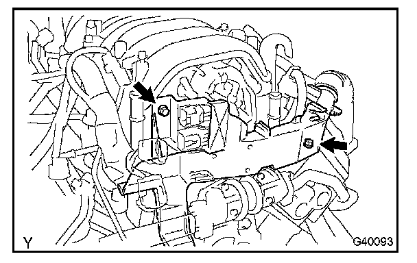 c. Remove the bolt and nut holding the engine wire protector from the intake manifold and cylinder head.