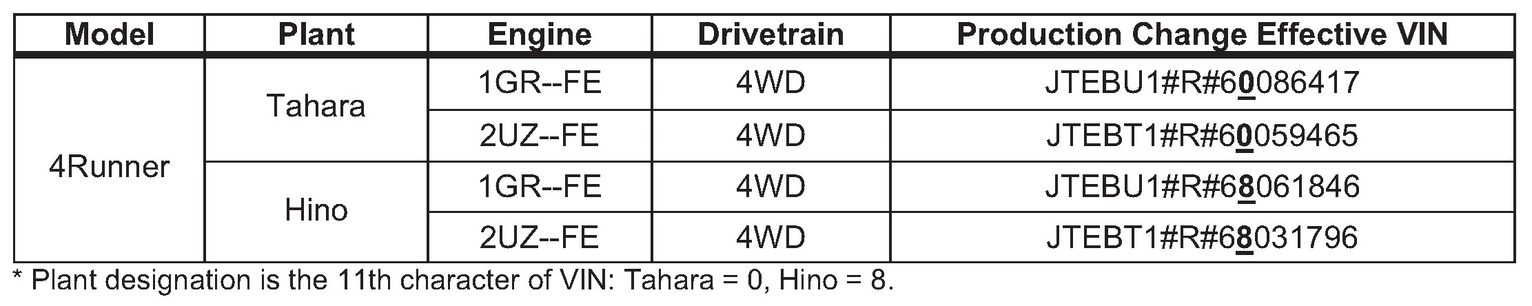 - 2005 - 2006 model year 4Runner vehicles produced BEFORE the Production produced BEFORE the Production Change Effective VINs shown below.