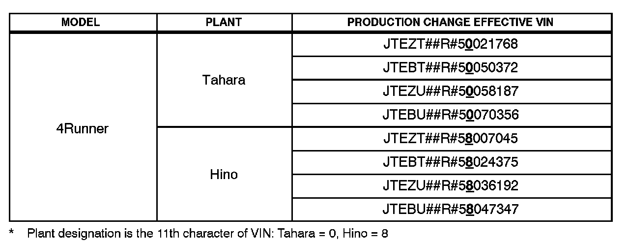 ^ 2005 model year 4Runner vehicles produced BEFORE the Production Change Effective VINs shown below.