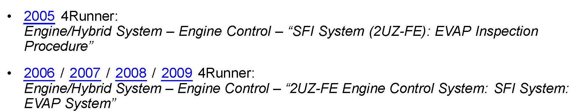 Some 2005 - 2009 model year 4Runner vehicles may exhibit a MIL "ON" condition with one or more of the following DTCs: P0455 & P0441 or P0456. Use the repair procedure below to address this condition.