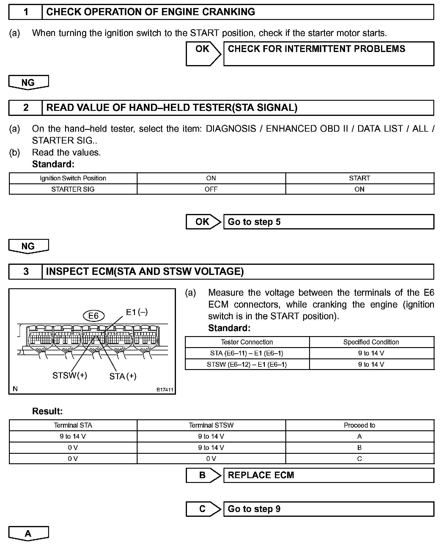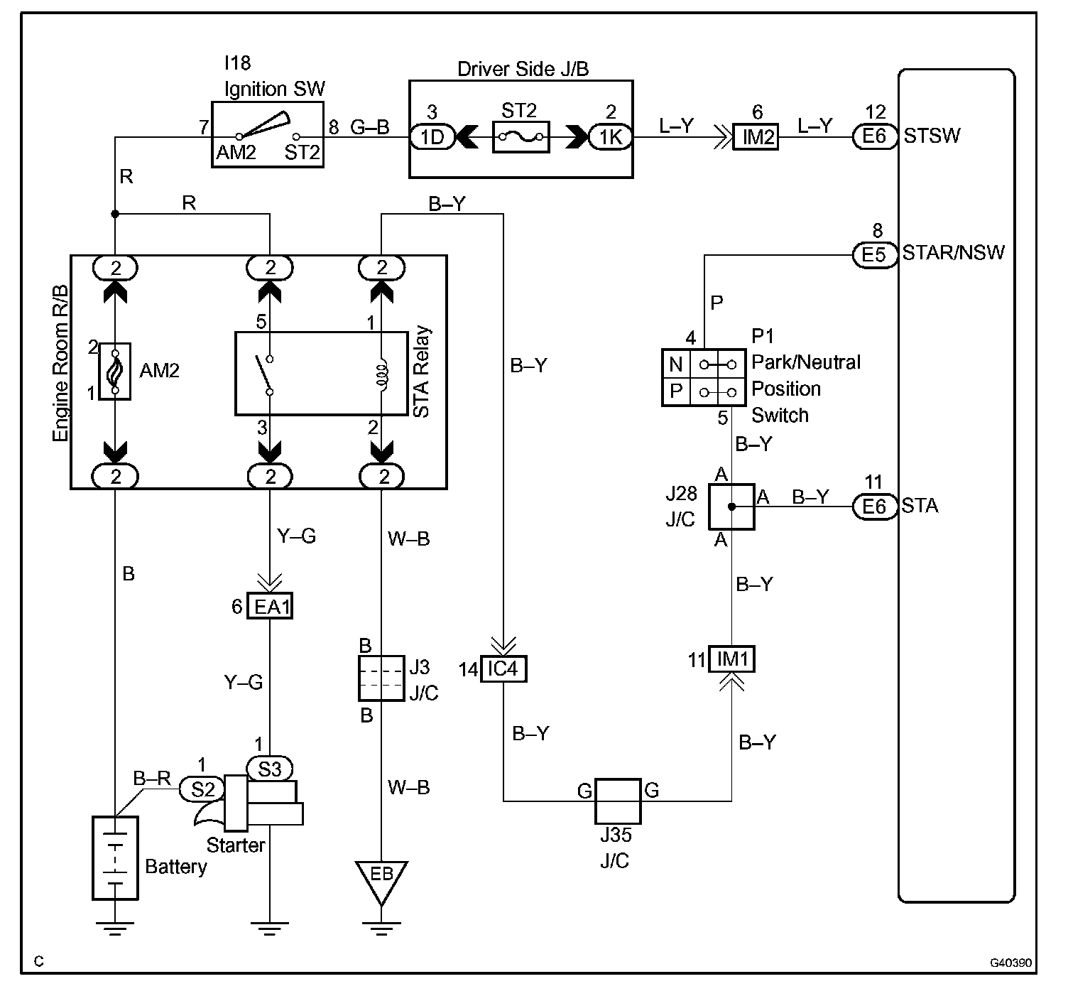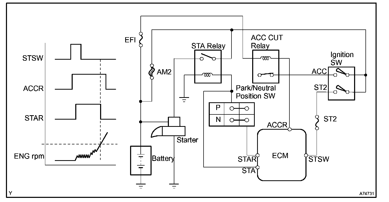 The starter is controlled by the ECM, when the ECM detects a start signal (STSW) from the ignition switch, this system monitors the engine speed (NE) and continues to operate the starter until it has determined that the engine has started (engine speed reaches approximately 500 rpm). If the engine is already running and the ignition switch is turned to START, the ECM will not operate the starter.
