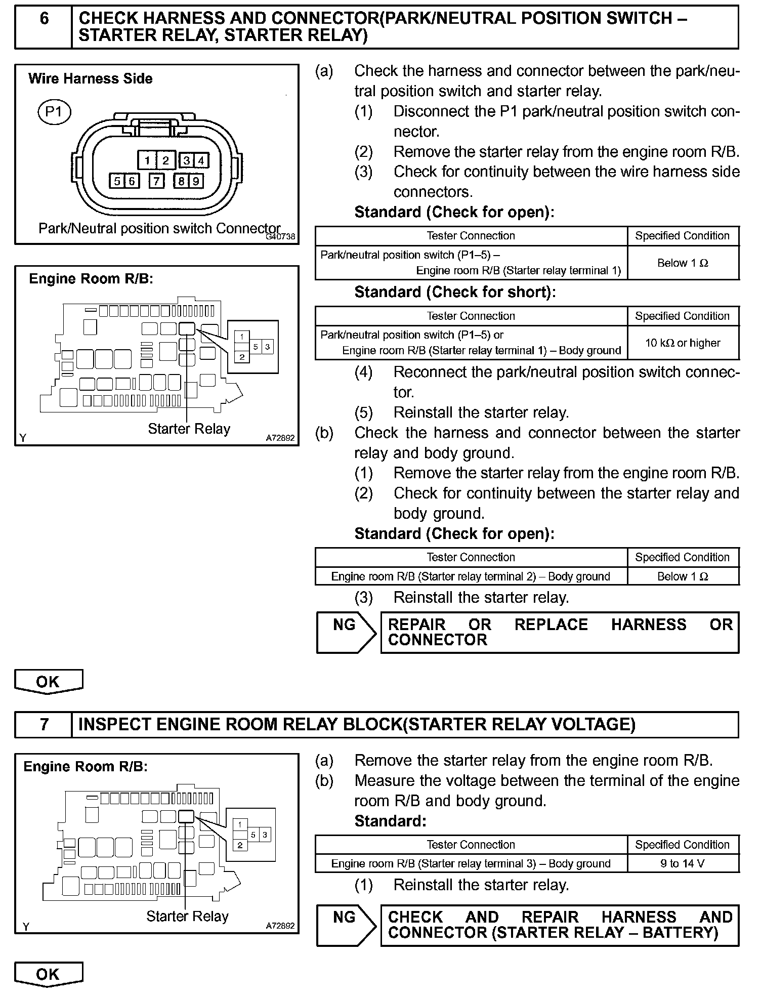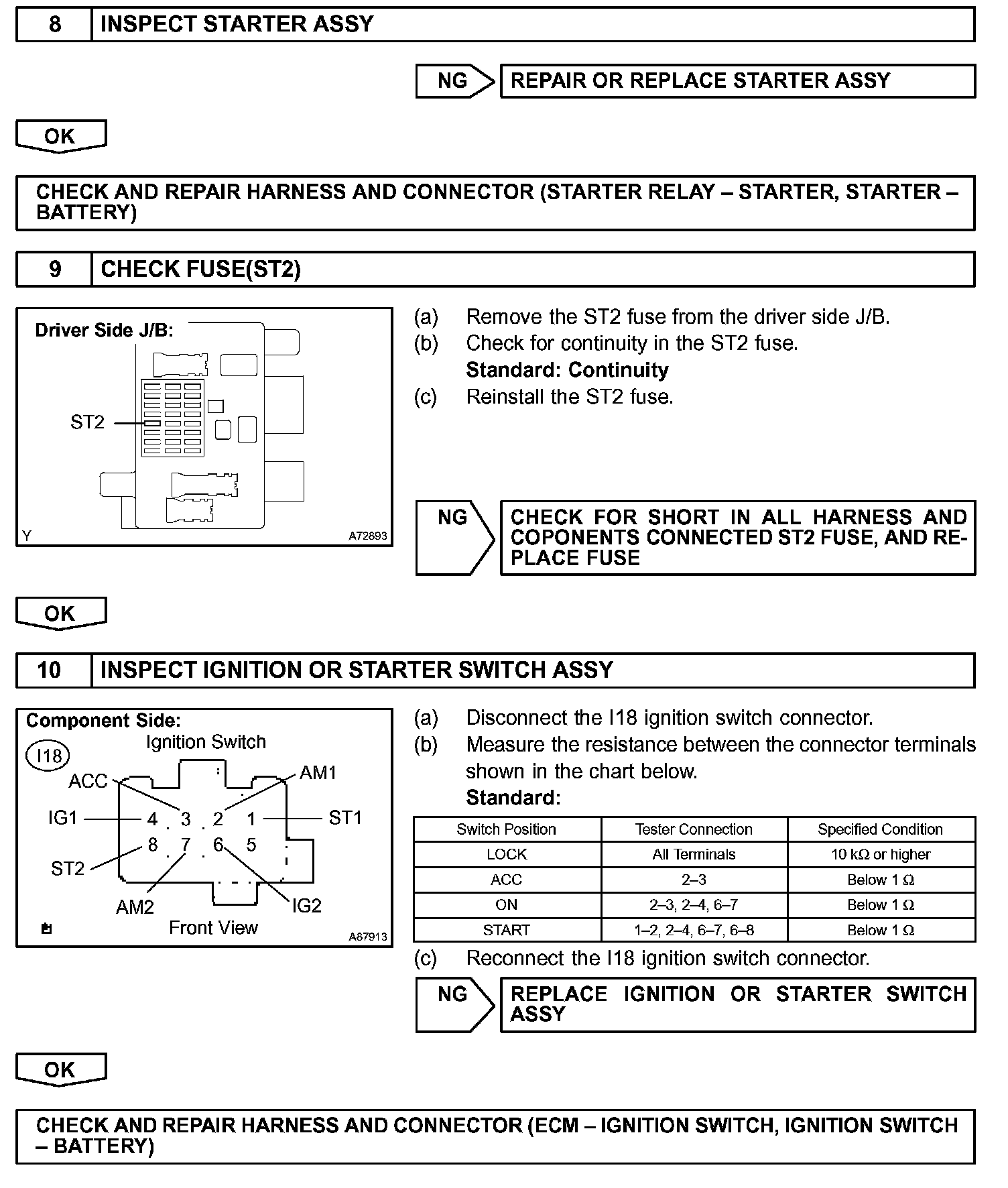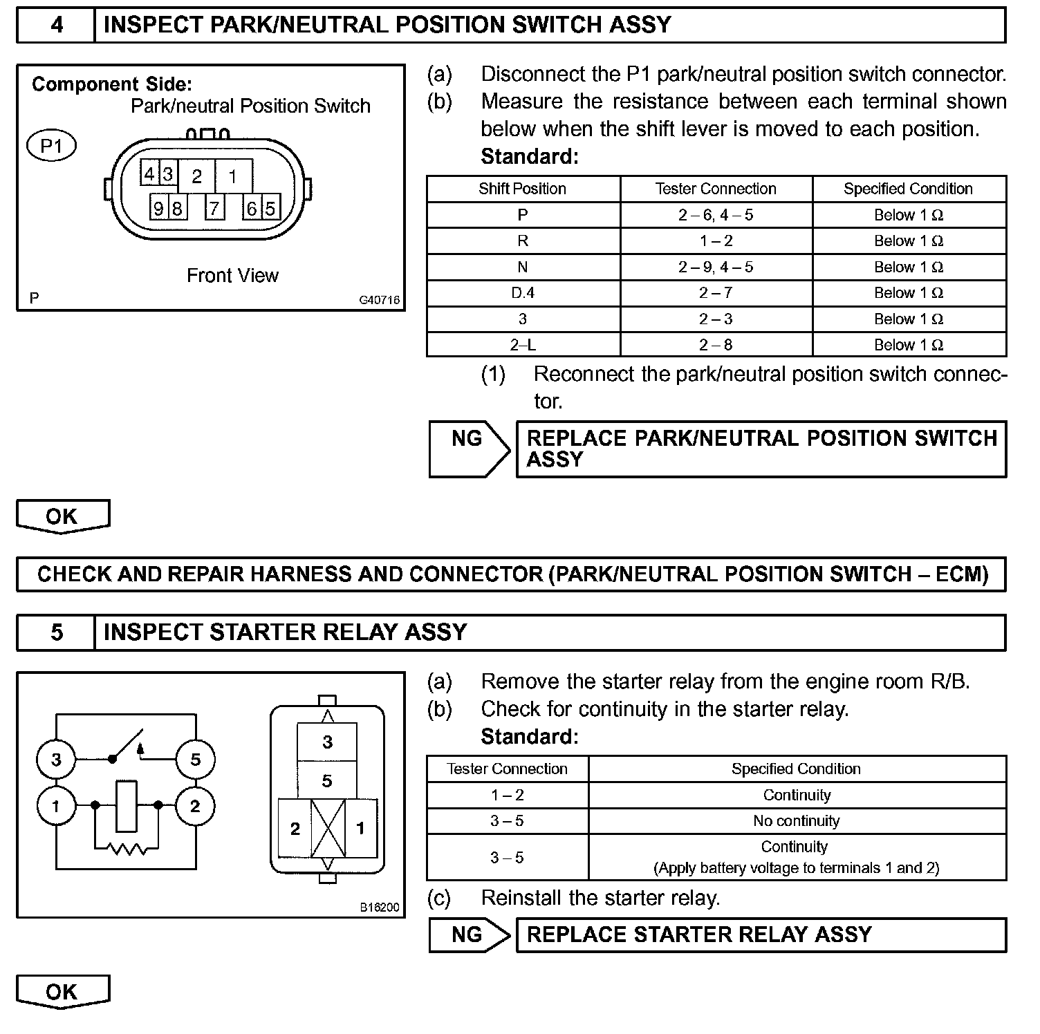 The starter is controlled by the ECM, when the ECM detects a start signal (STSW) from the ignition switch, this system monitors the engine speed (NE) and continues to operate the starter until it has determined that the engine has started (engine speed reaches approximately 500 rpm). If the engine is already running and the ignition switch is turned to START, the ECM will not operate the starter.