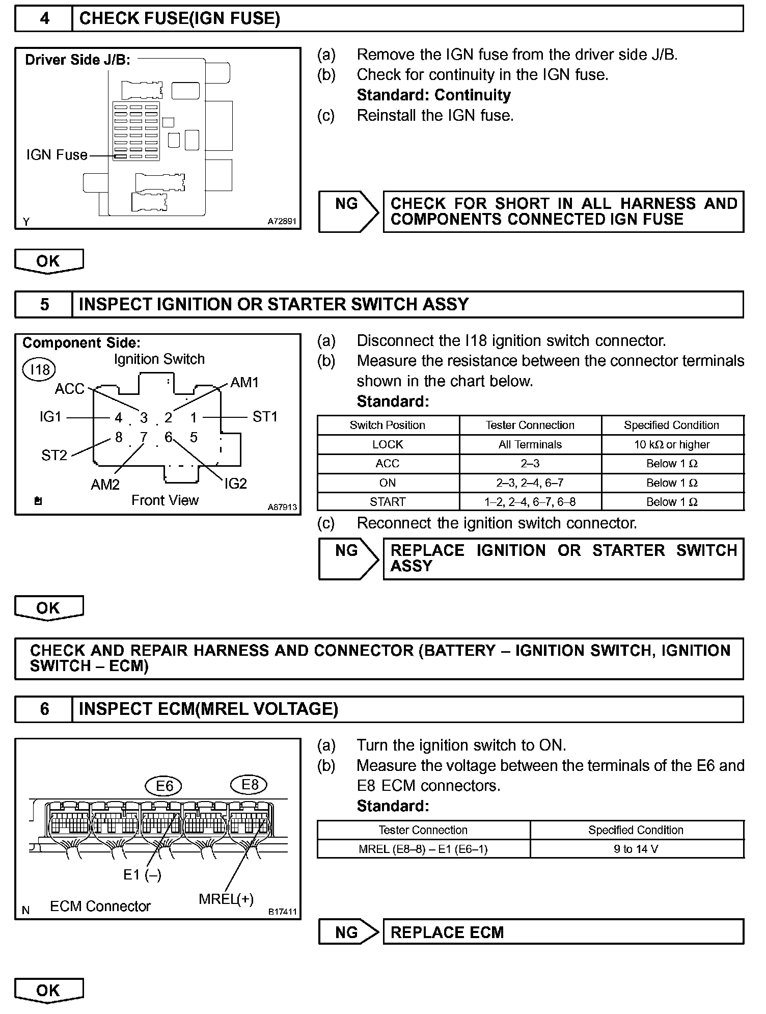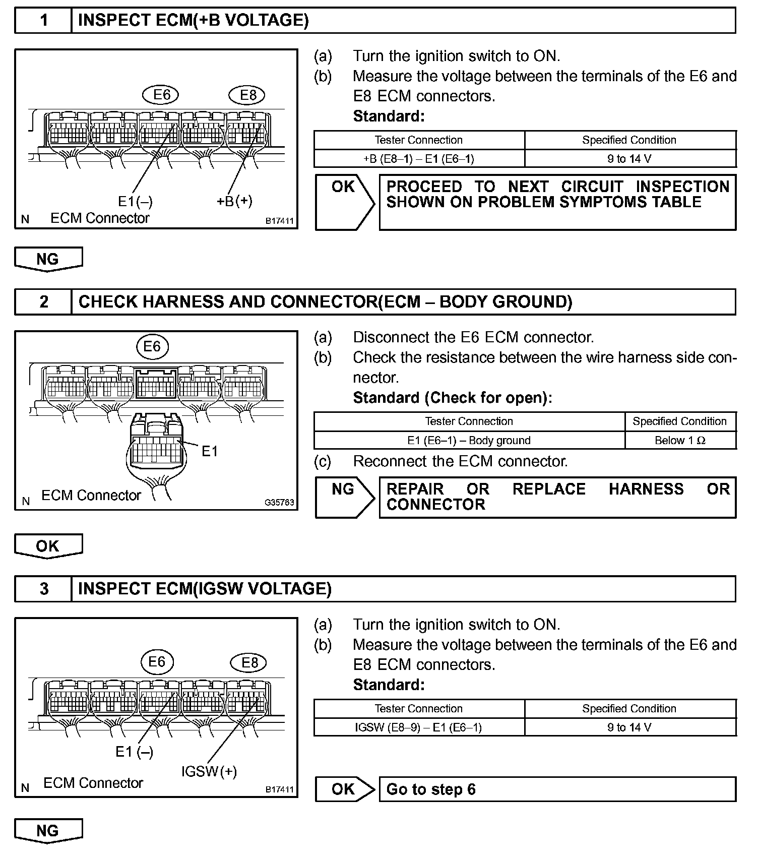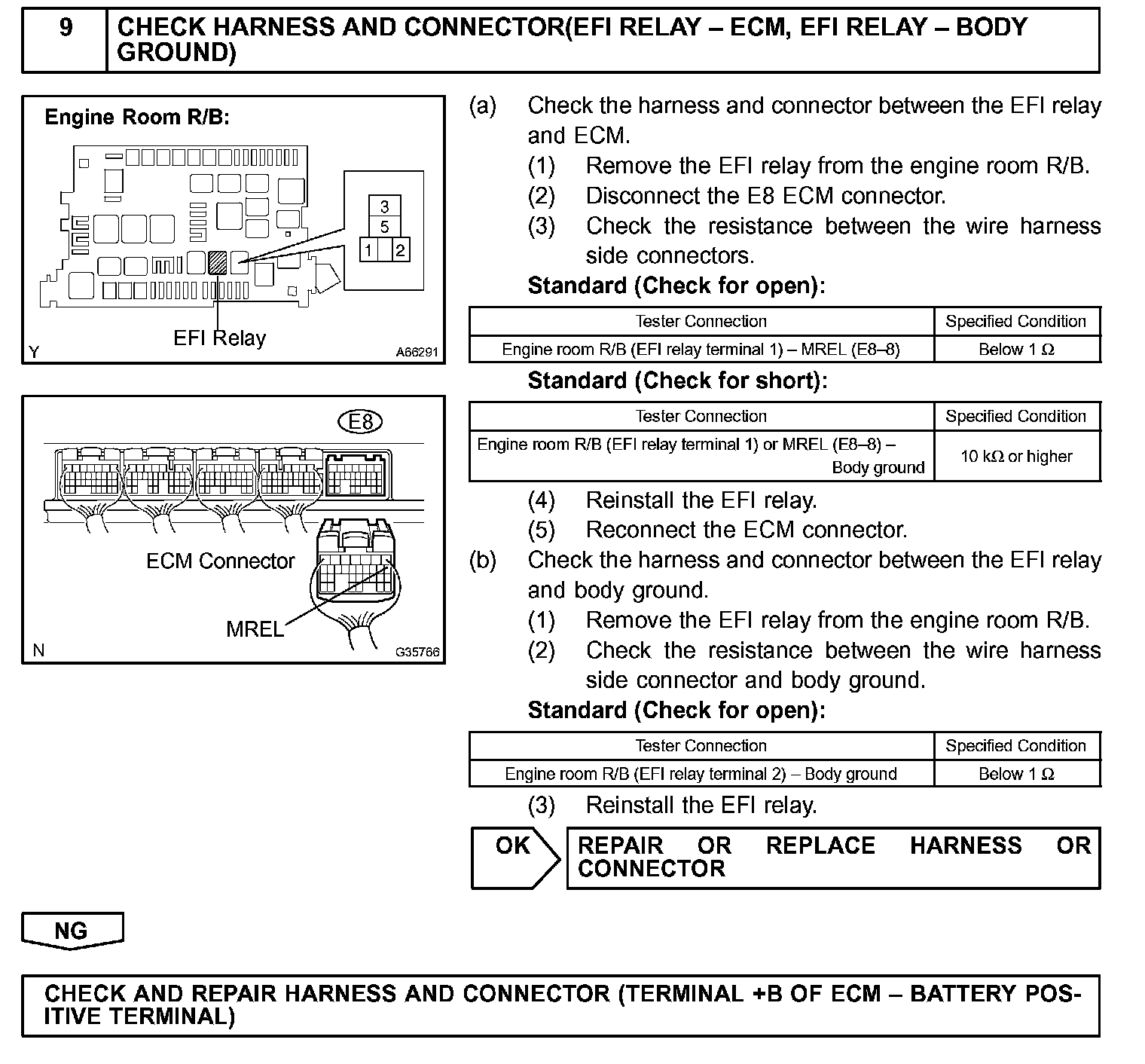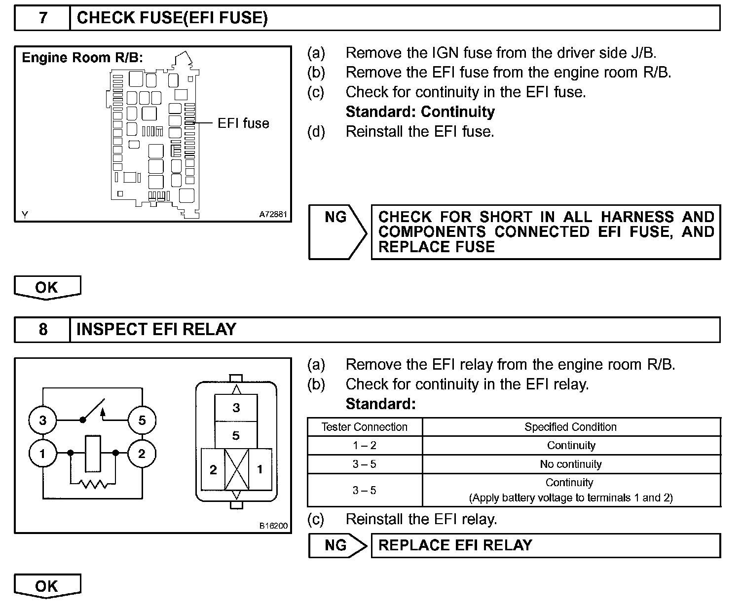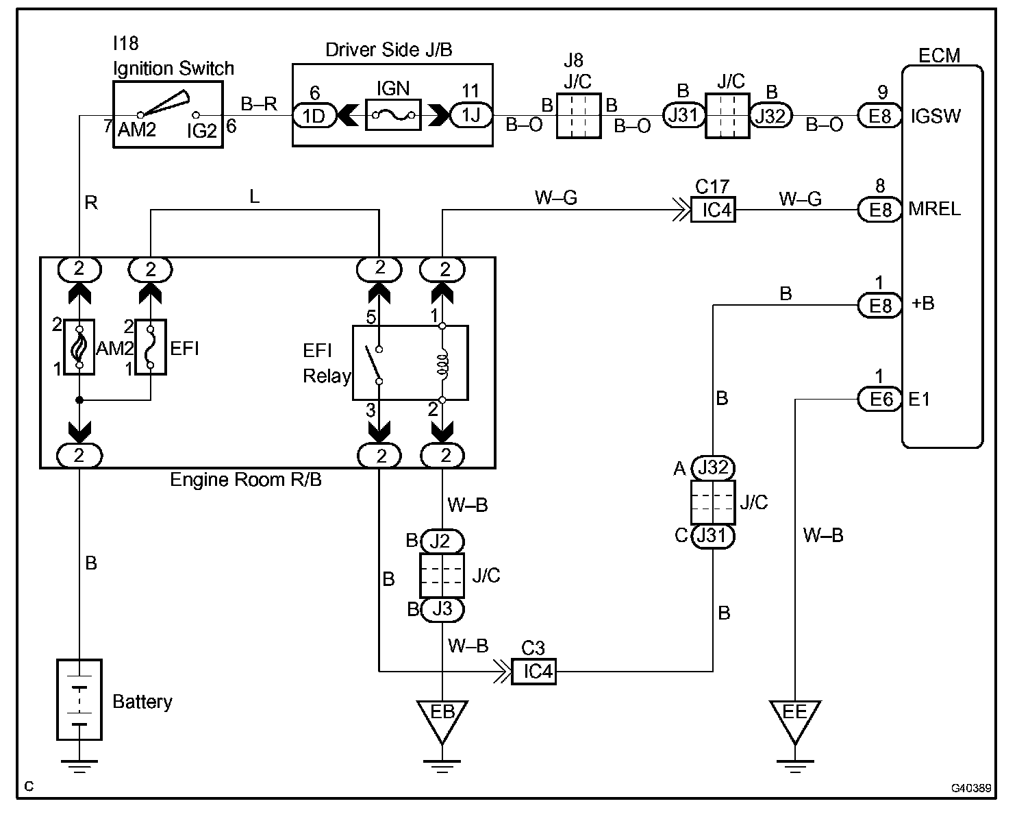 This signal causes current to flow to the coil, closing the contacts of the EFI relay and supplying power to terminal +B of the ECM.