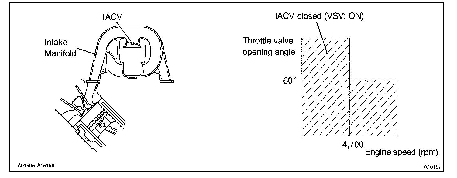 When the engine speed is 4,700 rpm or more and the throttle valve opening angle is 60° or more, the VSV is OFF, so the is IACV open. All the other times, the ECM turns the VSV ON and closes the IACV.