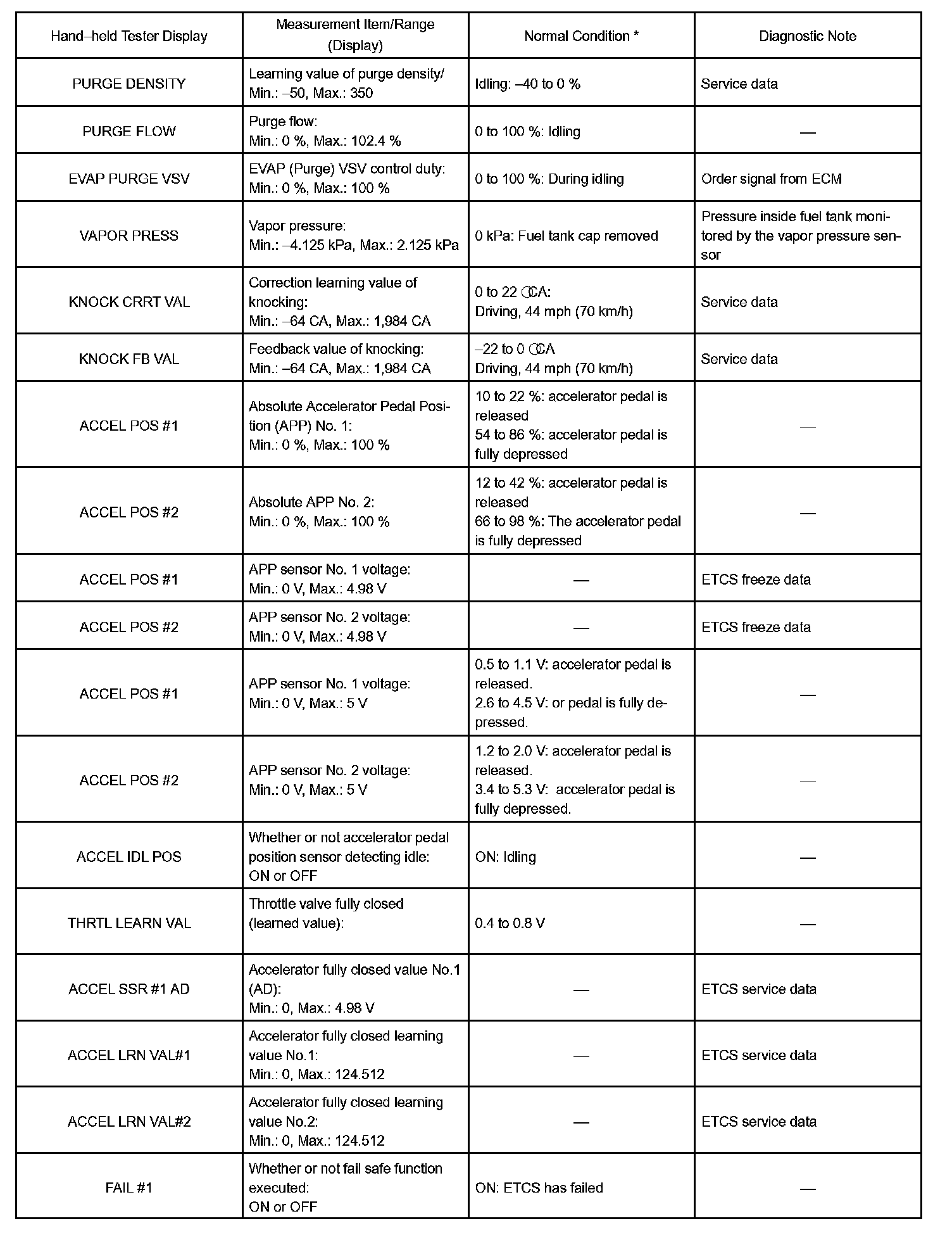 NOTE: In the table given, the values listed under "Normal Condition" are reference values. Do not depend solely on these reference values when deciding whether a part is faulty or not.
