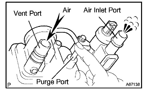 1. Blow air (0.39 kPa, 4.0 gf/sq.cm, 0.06 psi) into the vent port with the purge port closed, and check that the air flows from the air inlet port.