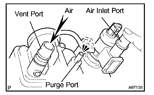 2. Blow air (0.39 kPa, 4.0 gf/sq.cm, 0.06 psi) into the vent port with the air inlet port closed, and check that air flows from the purge port.