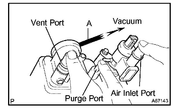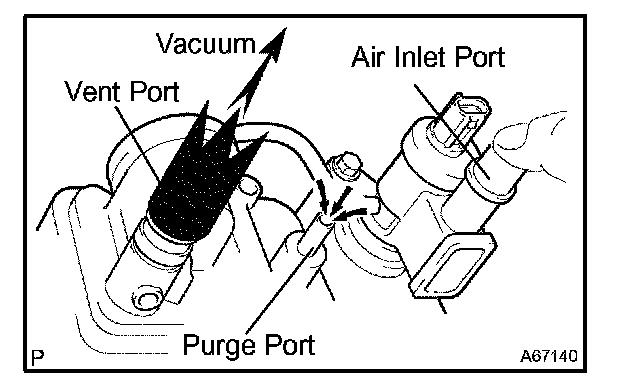 3. Apply vacuum (3.43 kPa, 25.7 mmHg, 1.01 in.Hg) to the vent port with the air inlet port closed, and check that air is sucked in from the purge port.