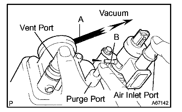 2. Apply vacuum (1.42 kPa, 11 mmHg, 0.42 in.Hg) into port A with the vent, purge and air inlet ports closed, and check that air is sucked in from port B.