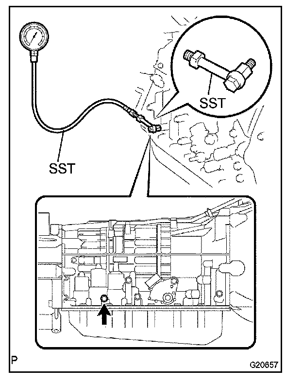 3. Remove the test plug on the transmission case center right side and connect SST.