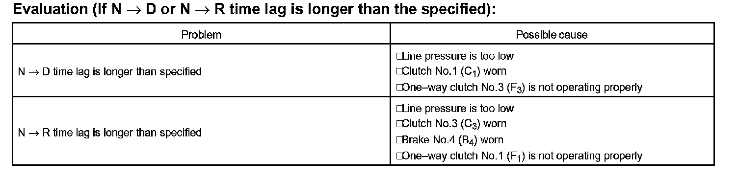 1. When the shift lever is shifted while the engine is idling, there will be a certain time lapse or lag before the shock can be felt. This is used for checking the condition of the direct clutch, forward clutch, and 1st and reverse brake.
