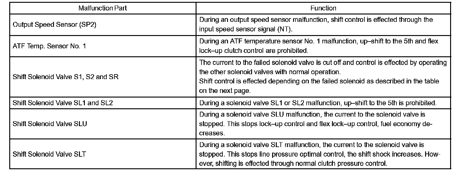 FAIL-SAFE CHARTThis function minimizes the loss of the ECT functions when any malfunction occurs in a sensor or solenoid.