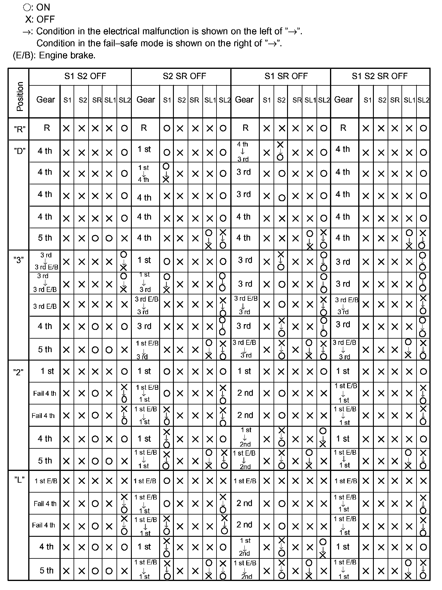 If either of the shift solenoid valve circuits has an open or short failure, the ECM turns the other shift solenoid "ON" and "OFF" in order to shift into the gear positions shown in the table.