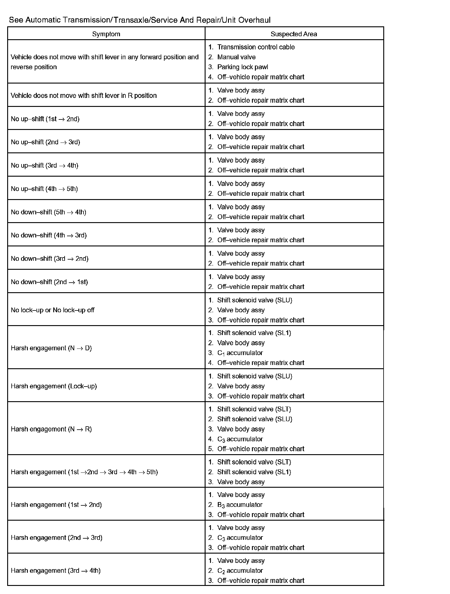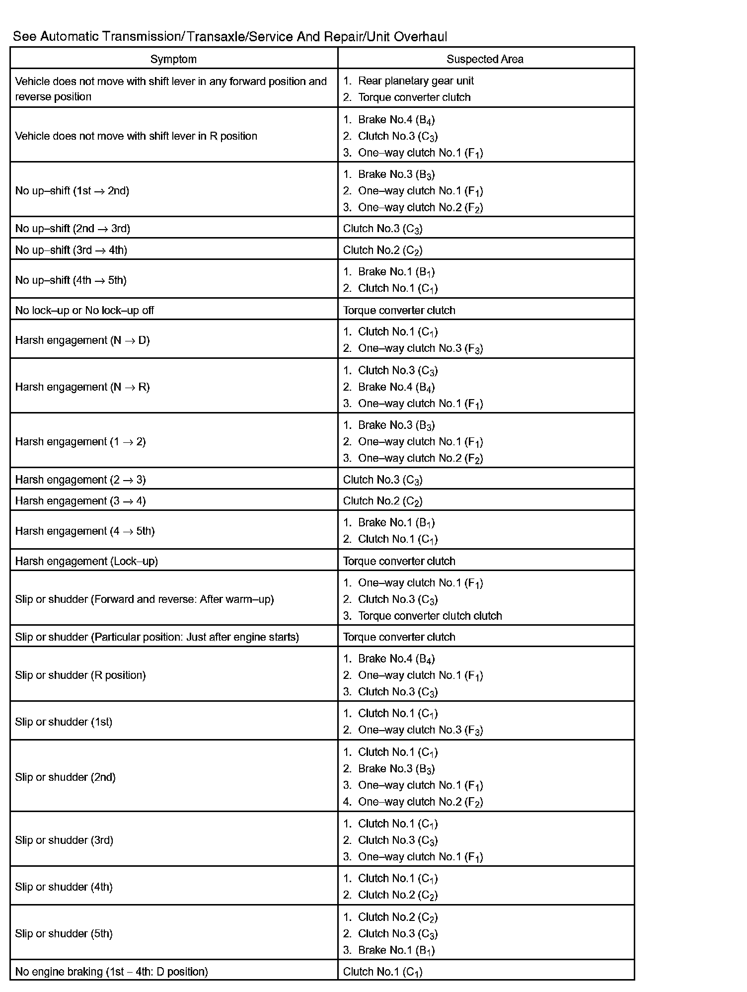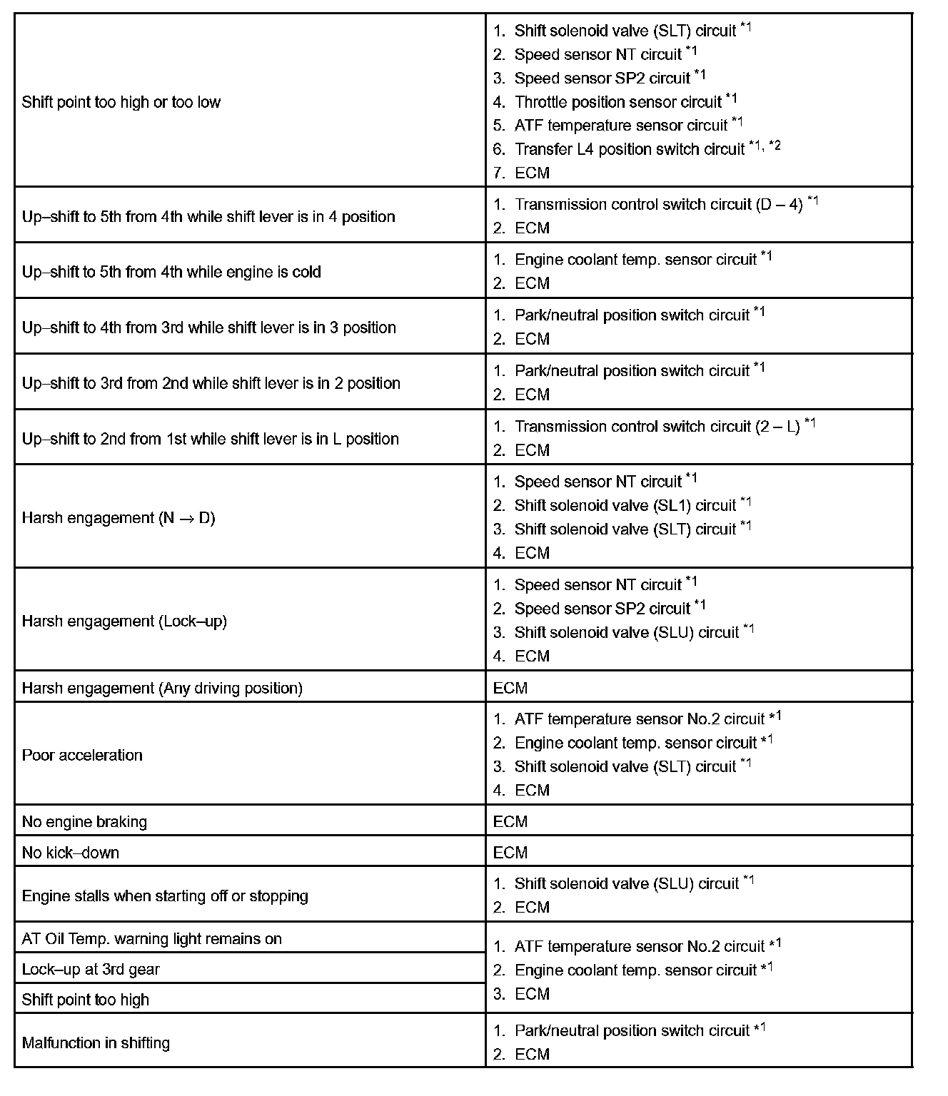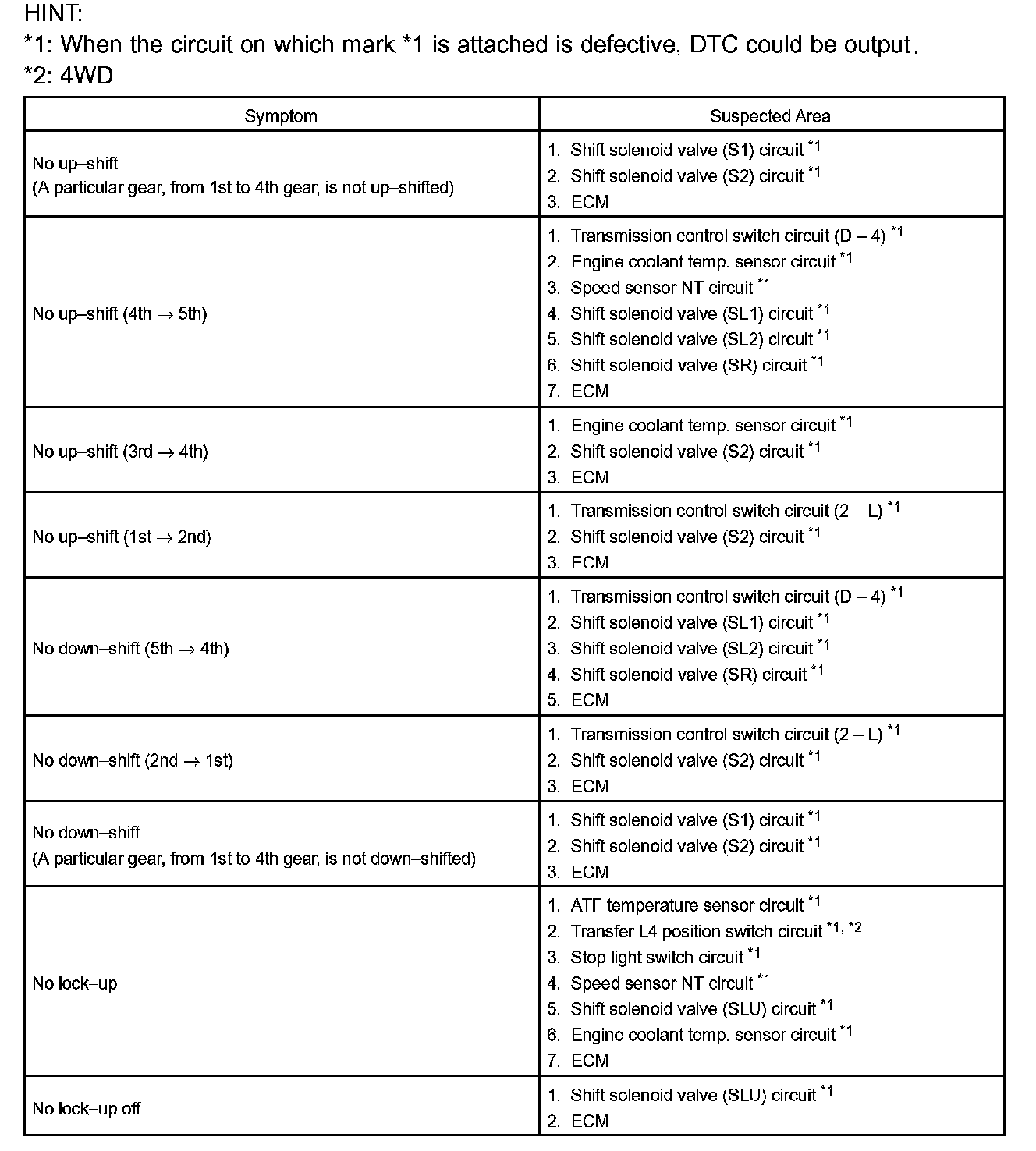 PROBLEM SYMPTOMS TABLEHINT: If a normal code is displayed during the diagnostic trouble code check although the trouble still occurs, check the electrical circuits for each symptom in the order given in the charts and proceed to the given troubleshooting.