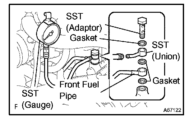 d. Install the front fuel pipe and SST (pressure gauge) to the delivery pipe with the 3 gaskets and another SST (adaptor).