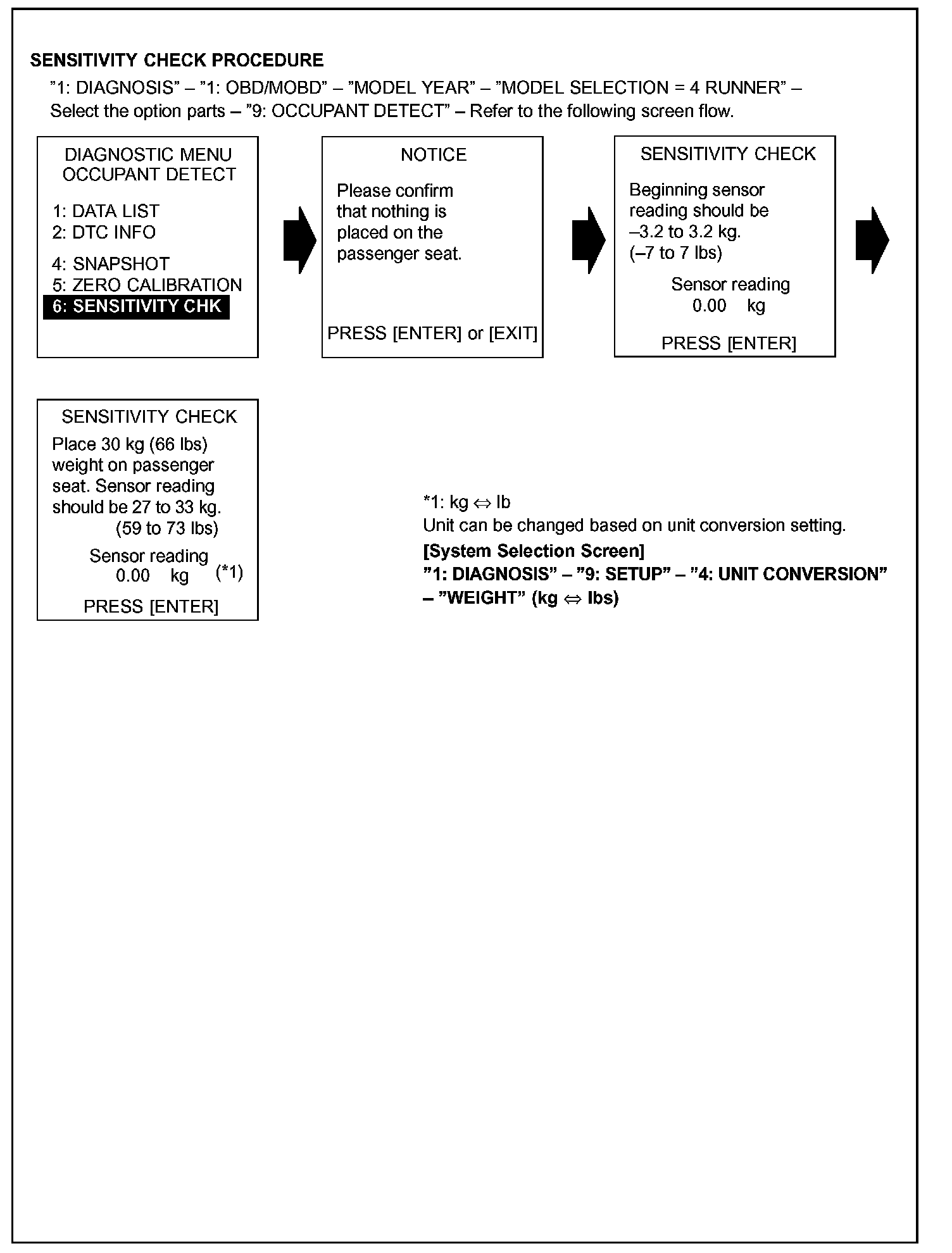 - When the sensitivity deviates from the standard value, retighten the bolts of the passenger seat taking care not to deform the seat rail. After performing this procedure, if the sensitivity is not within the standard value, replace the front RH seat assembly.