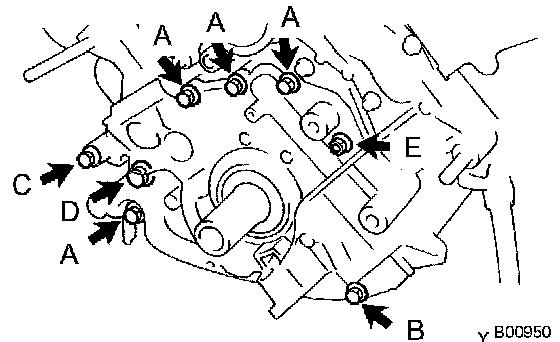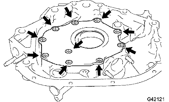 Install the oil pump with the 8 bolts. Uniformly tighten the bolts in several steps.