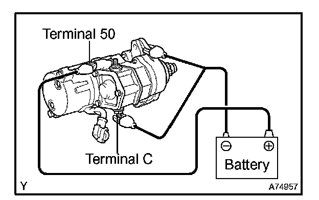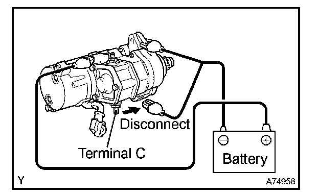 1. With battery connected as above with the clutch pinion gear out, disconnect the negative (-) lead from terminal C. Check that the pinion gear remains out.
