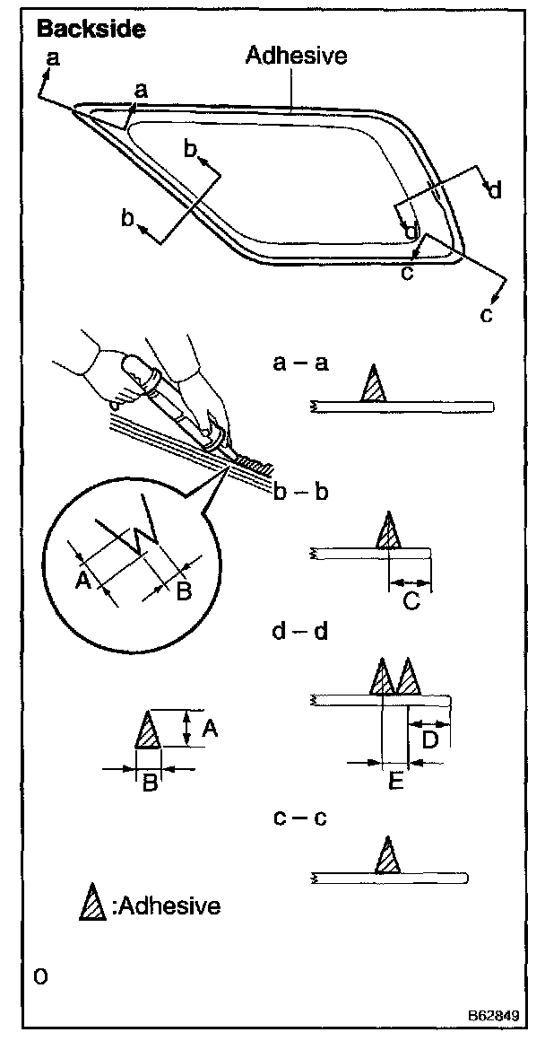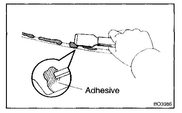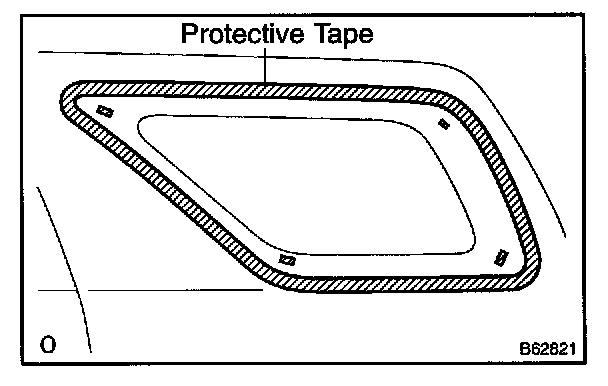 1. Hold quarter window assembly in place securely with protective tape or equivalent to the body until the adhesive hardens.