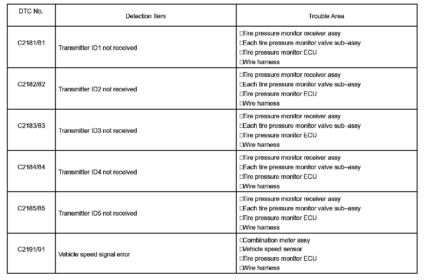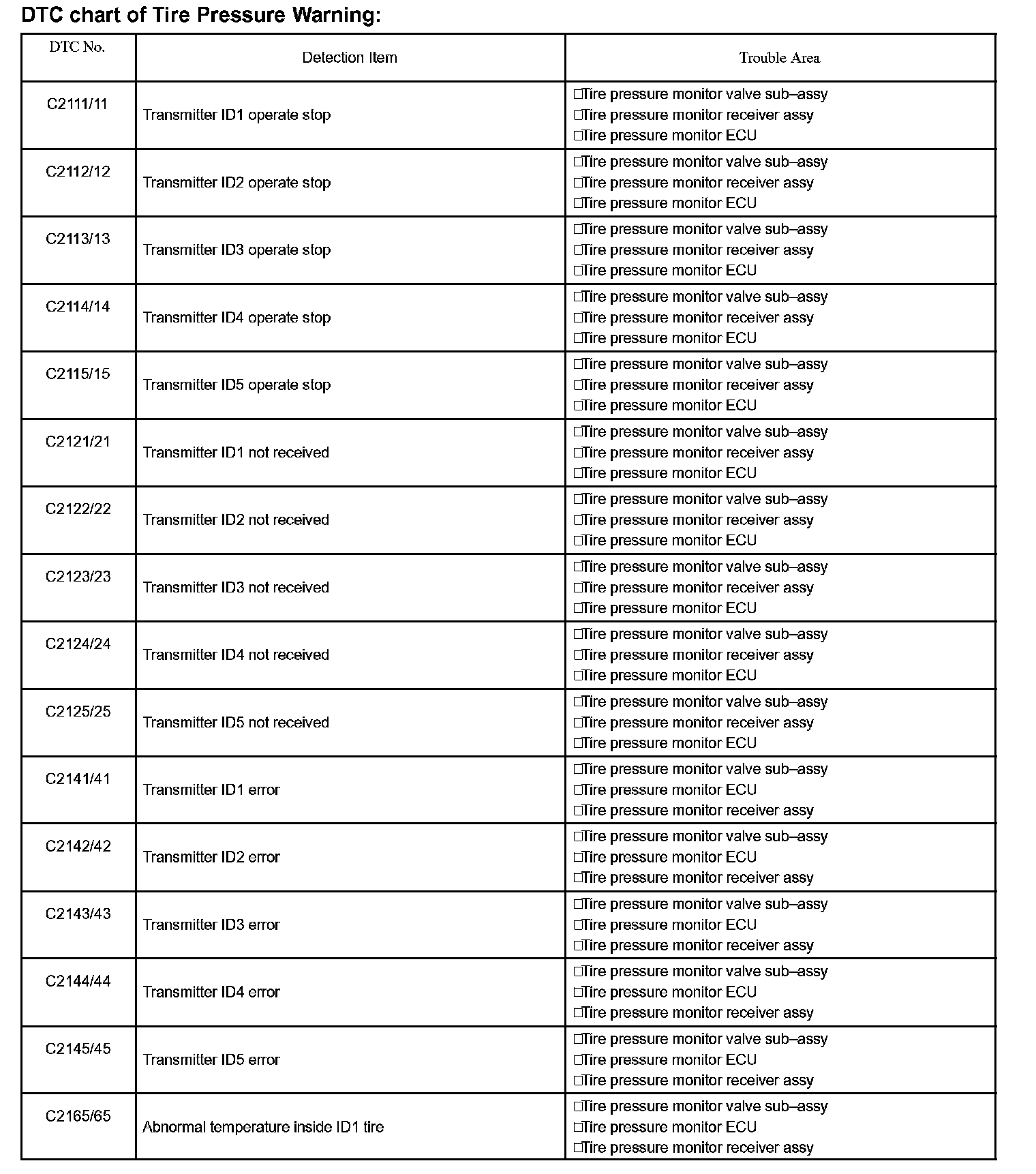 - If any abnormality is not found when the parts are inspected, inspect the tire pressure monitor ECU.