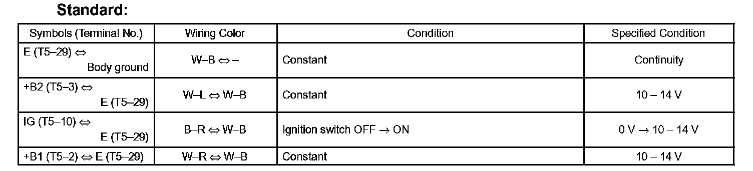 b. Reconnect the T5 ECU connector, and check the voltage between each terminal of the connector.
