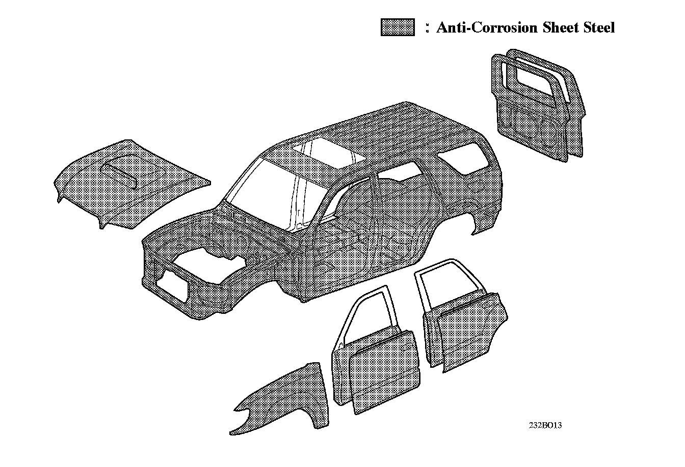 Rust-resistant performance is increased by using anti-corrosion sheet steel and anti-corrosion treatment by applying wax, sealer, anti-chipping paint, etc. to easily corroded parts such as the hood, doors, rocker panels, etc.