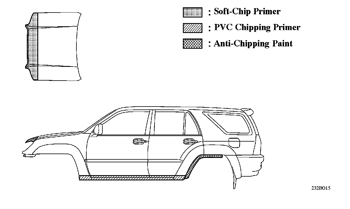 Anti-chipping paint applied around the wheel housing of all models. In addition, PVC chipping primer is applied to the rocker panel area of the outside molding on side stepless model. Furthermore Soft-chip primer is applied to the front end of the hood.