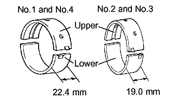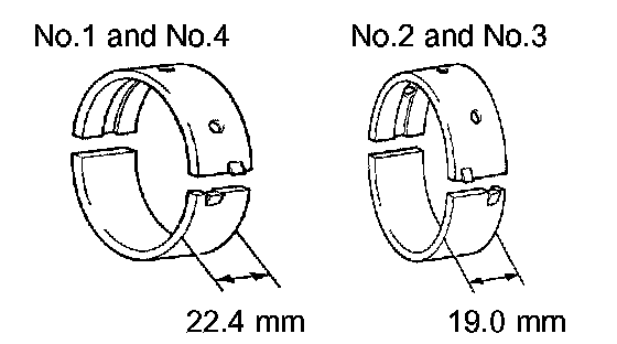 HINT: Main bearings come in widths of 19.0 mm (0.748 inch) and 22.4 mm (0.882 inch). Install the 22.4 mm (0.882 inch) bearings in the No.1 and No.4 cylinder block journal positions with the main bearing cap. Install the 19.0 mm (0.748 inch) bearings in the No.2 and No.3 positions.