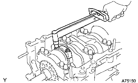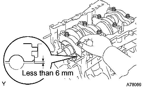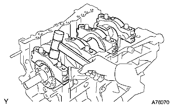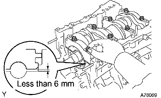 g. Install the main bearing caps. Tighten the 2 bolts for each bearing cap until the clearance between the bearing cap and the cylinder block becomes less than 6 mm (0.23 inch).