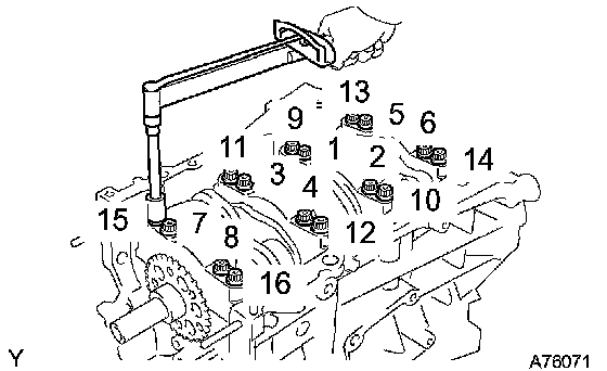 j. Install the 16 main bearing cap bolts. Using several steps, tighten the bolts uniformly in the sequence as shown in the illustration.