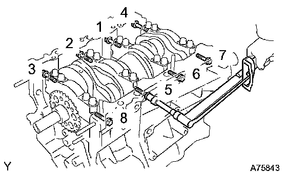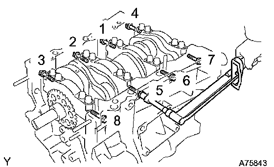 o. Using several steps, tighten the 8 main bearing cap bolts uniformly in the sequence as shown in the illustration.
