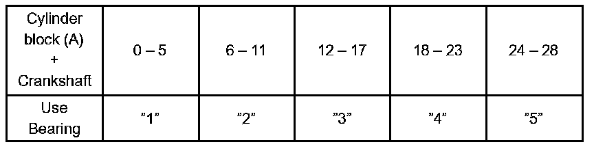 s. If replacing a bearing, replace it with one that has the same number. If the number of the bearing cannot be determined, select the correct bearing by adding together the numbers imprinted on the cylinder block and crankshaft, then refer to the table for appropriate bearing number. There are 5 sizes of standard bearings, marked "1", "2", "3", "4" and "5" accordingly.