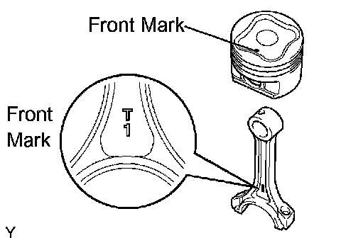 c. Align the front marks of the piston and connecting rod, and push in the piston pin with a thumb.
