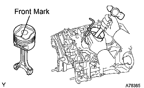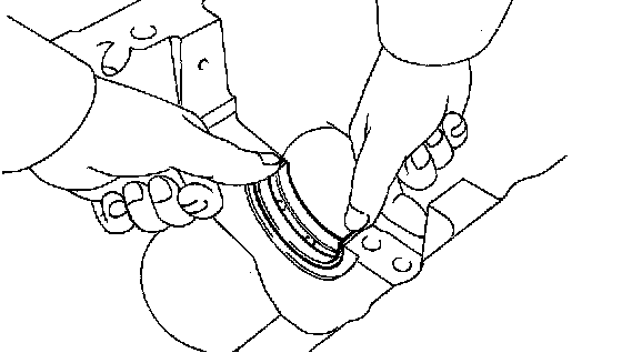 c. Using a piston ring compressor, push the correctly numbered piston and connecting rod assemblies into each cylinder with the front mark of the piston facing forward.