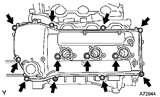 a. Remove the 10 bolts, 3 seal washers, 2 nuts, cylinder head cover and gasket.