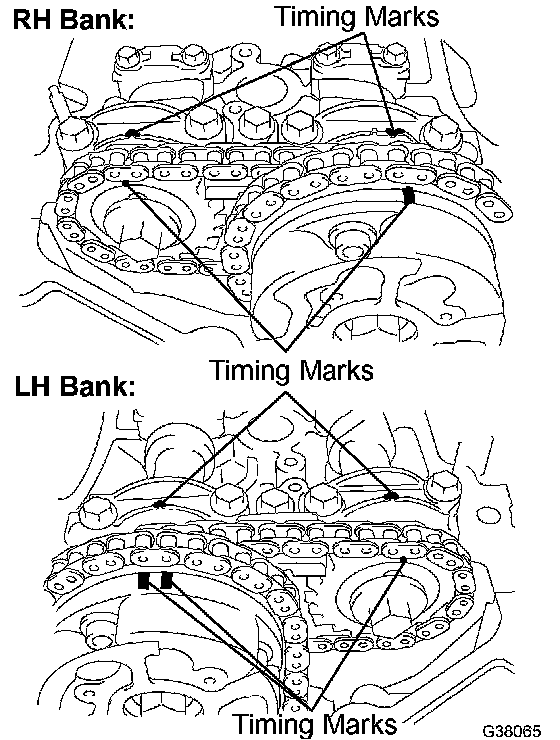 b. Check that the timing marks of the camshaft timing gears are aligned with the timing marks of the bearing caps as shown in the illustration.
