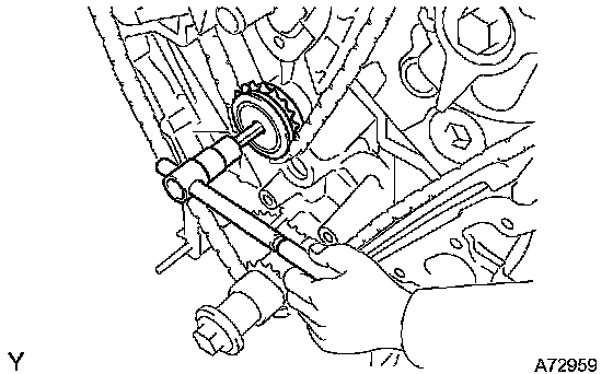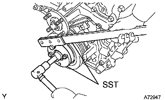 c. Using SST, hold the crankshaft pulley and loosen the pulley set bolt.