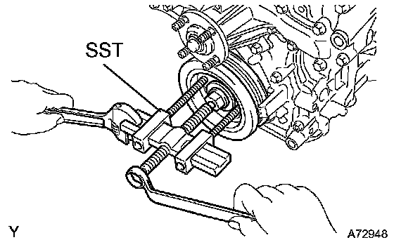 d. Using the pulley set bolt and SST, remove the crankshaft pulley.