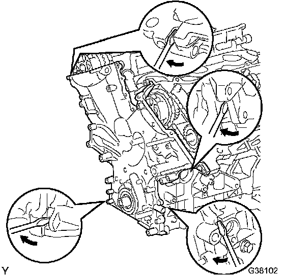 NOTICE: Be careful not to damage the contact surfaces of the timing chain cover, cylinder block and cylinder head.