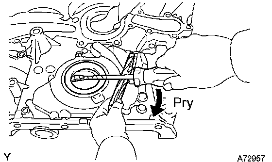 NOTICE: Be careful not to damage the oil pump assembly. Wrap the tip of the screwdriver with tape.