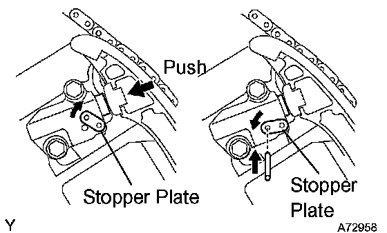 a. While turning the stopper plate of the tensioner clockwise, push in the plunger of the chain tensioner as shown in the illustration.